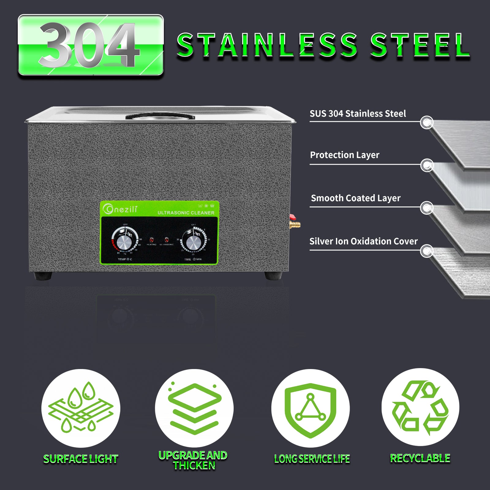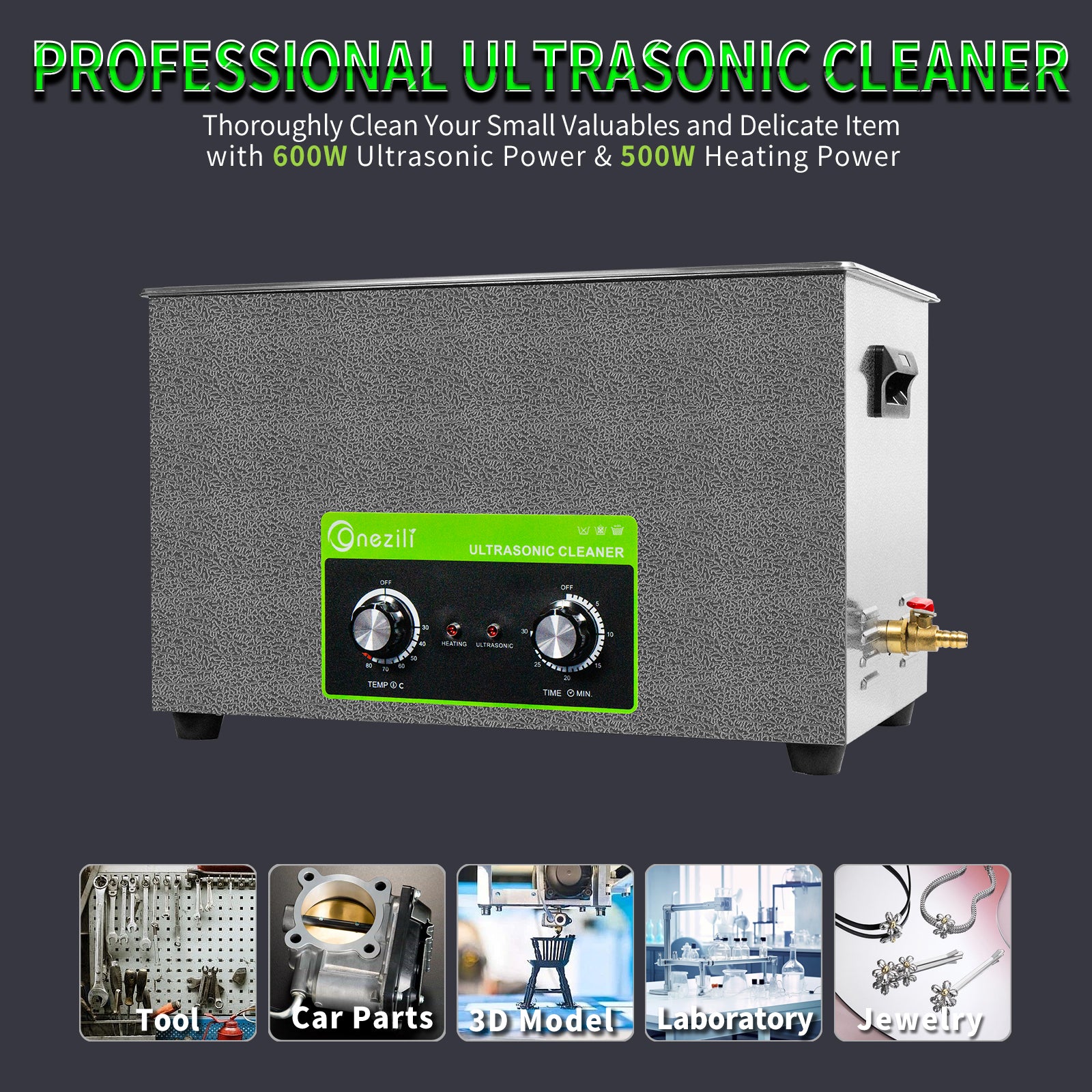 The ONEZILI 30L Ultrasonic Cleaner is a powerful and versatile cleaning solution designed to tackle everything from delicate personal items to heavily soiled industrial components. Its generous 30L tank, made from high-grade SUS304 stainless steel, is built to resist cavitation erosion and withstand strong solvents. Combining high-frequency 40kHz ultrasonic waves with an adjustable heating system, it effortlessly removes tough contaminants like grease, oil, carbon deposits, and grime from intricate parts and hard-to-reach crevices.